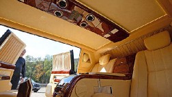 В салоне нового президентского лимузина установлены четыре VIP-кресла, которые оснащены электроприводом, функциями вентиляции и подогрева пятой точки пассажиров, складывающиеся столики, два TFT-экрана. В отделке салона применены высококачественная кожа, надеюсь не «бедных» либералов, и дорогие породы дерева.